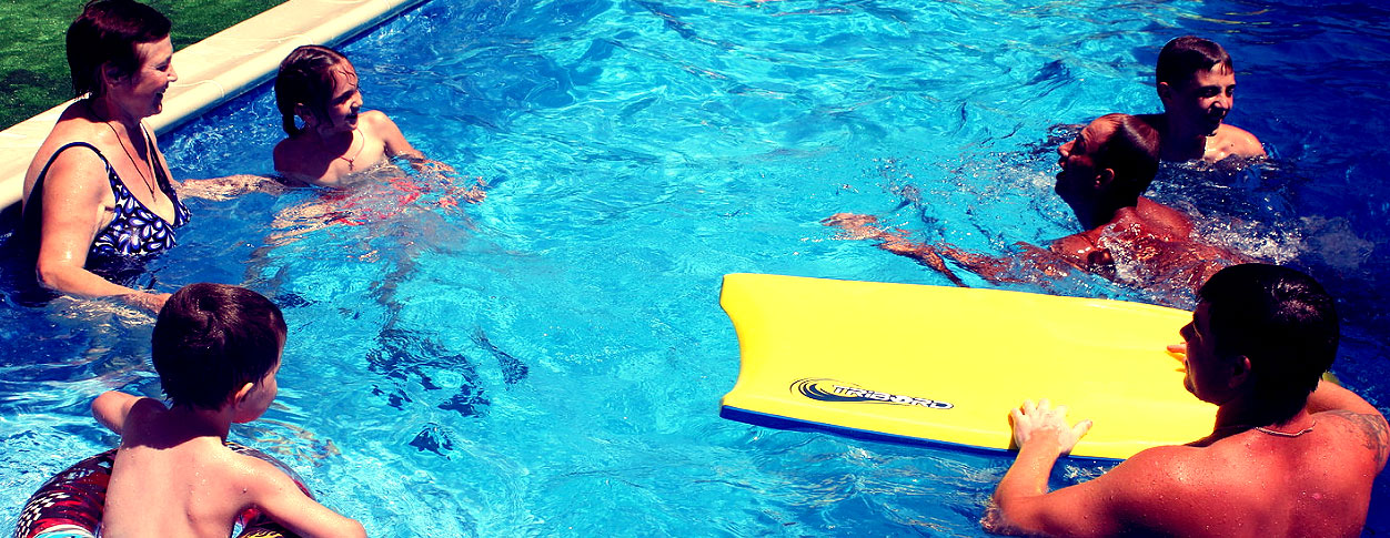 Рядом с бассейном располагается летняя площадка со столиками, где можно провести время после купания.